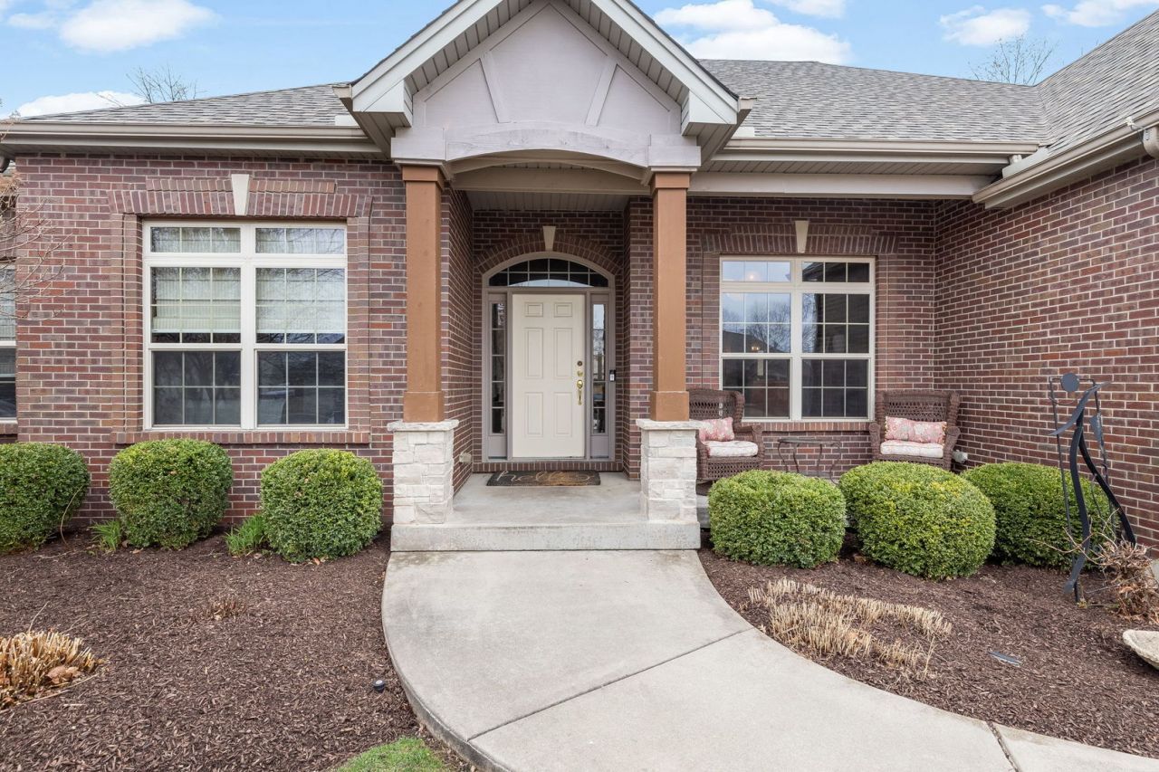 Stunning brick ranch in desirable Rivers Edge, set on a premium lot backing to a private nature preserve with exceptional indoor-outdoor living! Offering approximately 2300 sq ft on the main level, this beautifully designed home features an open-concept layout, soaring vaulted ceilings, and high-end finishes throughout. The great room on the main level is the centerpiece, showcasing a dramatic floor-to-ceiling stone fireplace, rich hardwood flooring, and expansive windows that fill the space with natural light while capturing serene preserve views. The gourmet kitchen impresses with 51 custom cabinetry, quartz countertops, a full marble backsplash, and a large butcher block island with stools, along with high-end Thermador appliances, including oven, microwave, and dishwasher, and a wine fridge-ideal for everyday living and entertaining. It makes cooking a pleasure! Enjoy seamless flow from the foyer to the open dining room, great room, and eating area, and gourmet kitchen with direct access to the large cedar deck overlooking the private backyard and stone patio. The main level features 3 bedrooms, including a luxurious primary suite with a spa-inspired primary bath featuring a freestanding soaking tub, a custom-designed oversized glass walk-in shower with dual showerheads, a seat, and a custom dual vanity. Also, in the primary bath, there is a large walk-in closet and linen closet. The finished walk-out basement adds approximately 1,800 sq ft of additional living space, offering a spacious family room, pool table, recreation area, 4th bedroom, full bath, second wine fridge, and plumbing for a future wet bar. A large storage area provides excellent additional space. Step outside to your private backyard oasis, complete with a stone patio featuring a built-in gas fire pit, sprinkler system, landscape lighting on timers, invisible fence to keep your dog in the yard, and gutter leaf guards for low-maintenance living, all backing to mature trees and the nature preserve for exceptional privacy. Located in sought-after Rivers Edge, this home offers a rare combination of luxury, space, and an exceptional setting. A must-see, this one will not last long.
